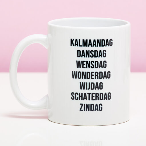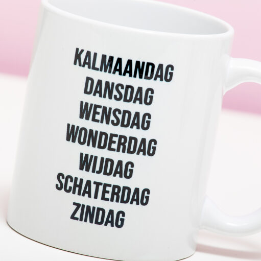 Sta jij positief in het leven en heb je altijd zin in de nieuwe dag? Dan past de Mok Kalmaandag, dansdag, wensdag goed bij jou! Deze mok bevat alle dagen van de week, maar dan wel met een twist: kalmaandag, dansdag, wensdag, wonderdag, wijdag, schaterdag en zindag. Een vrolijke mok voor vrolijke types.
