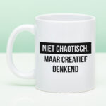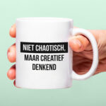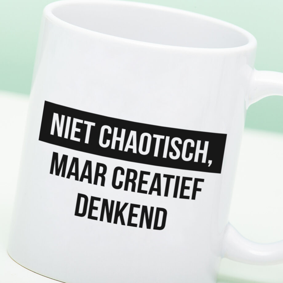 • Beker met de tekst: Niet chaotisch, maar creatief denkend