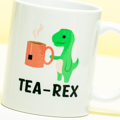 - Met de afbeelding van een T-rex en de tekst Tea-Rex