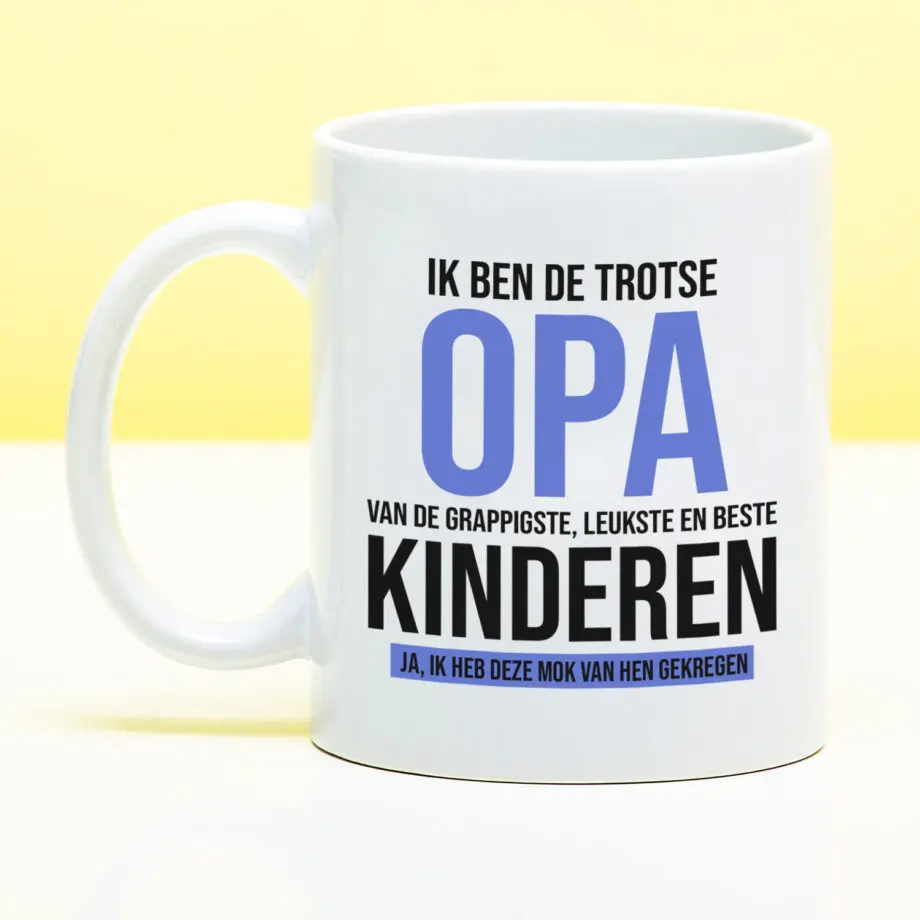 - Op de mok staat: Ik ben de trotse opa/oma/oom/tante van de grappigste, leukste en beste kinderen. Ja, ik heb deze mok van hen gekregen.