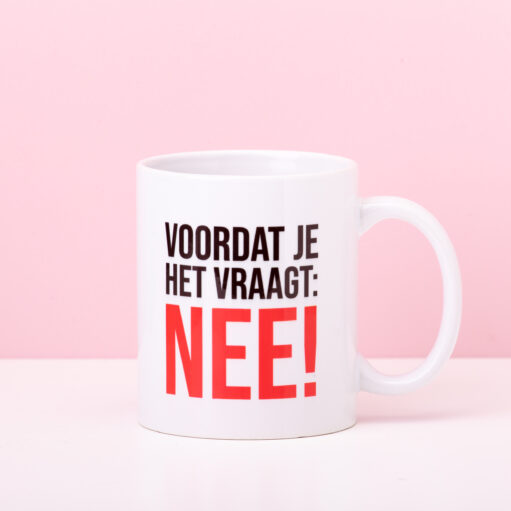 Kun jij wel een assertiviteitstraining gebruiken, maar is dat nog een stapje te ver? Misschien kun je dan de Mok Voordat je het vraagt eens meenemen naar kantoor. Deze hilarische mok is bedrukt met de tekst: Voordat je het vraagt: NEE! Handig om op je collega te richten of op je dochter die non-stop zeurt om een puppy. De beker is ook een perfect cadeautje voor een collega die alle vervelende klusjes moet doen.