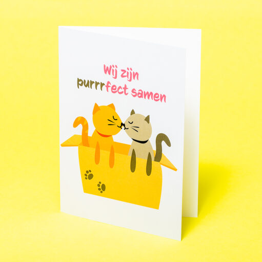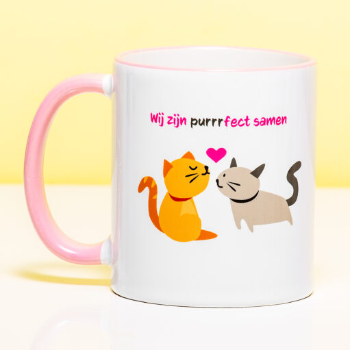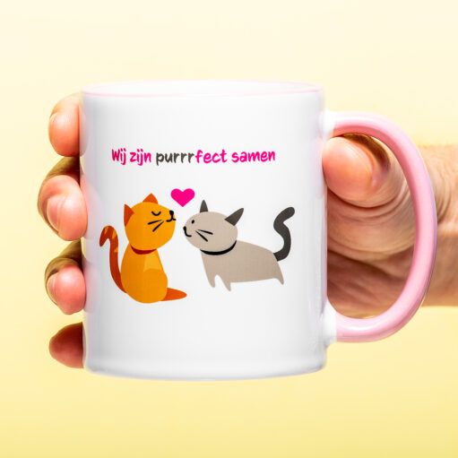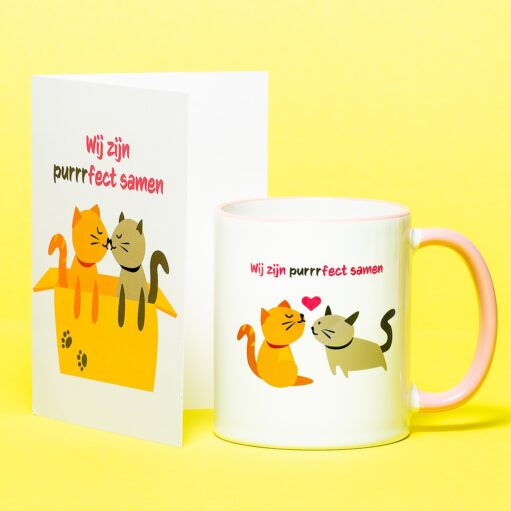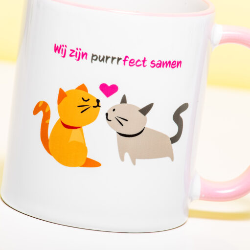 Het is niet makkelijk om het hart van een kattenliefhebber te veroveren als je zelf niet regelmatig in de gordijnen hangt. Toch is het mogelijk. En om die liefde bloeiend te houden, verras je de ander met de Mok Wij zijn purrrfect samen. Op de mok staat twee verliefde katten, met de tekst Wij zijn purrrfect samen. Een origineel cadeautje voor Valentijn of om je partner gewoon te verrassen.