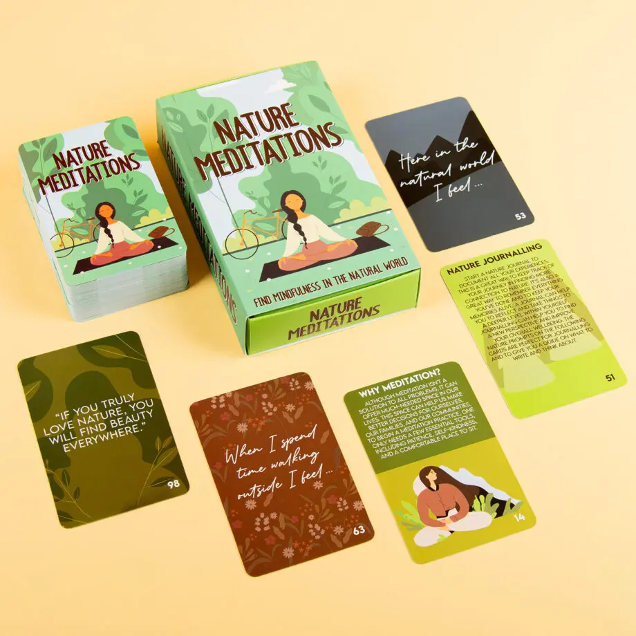 De geur van nat gras, het bos na een regenbui of velden vol lavendel: sta jij weleens stil bij wat de natuur allemaal heeft te bieden? Met de Nature Meditations kaarten van Gift Republic leer je hoe je je daar bewuster van kan worden. Deze set van honderd kaarten geeft tips hoe je meer in het hier en nu kunt leven en richt zich daarbij op de natuur. De kaarten bevatten tips en activiteiten. Zo leer je bijvoorbeeld waarom buiten wandelen zo goed is voor je mentale gezondheid.