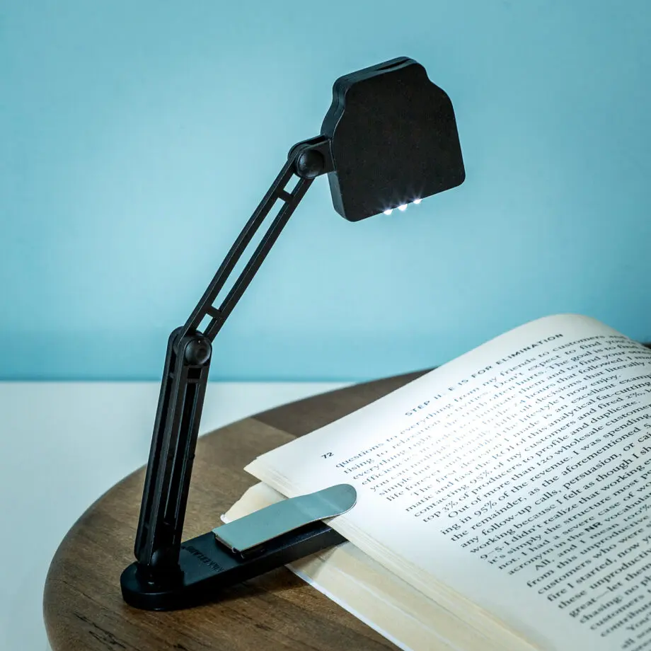 โs Avonds in bed nog even een boek lezen? Met dit Opvouwbare leeslampje van Kikkerland moet dat zeker lukken. Deze modern vormgegeven lamp zet je op de hoek van je boek en verlicht je paginaโs, zodat je gewoon in het donker kunt lezen. Vind je het niet praktisch om het lampje aan je boek te clippen? Dan kun je het ook gewoon op een vlakke ondergrond zetten, zoals op je nachtkastje. De arm van het zwarte leeslampje is op te vouwen, dus je kunt hem na gebruik makkelijk opbergen. Zo heb je altijd een helder lichtje bij de hand en lees je dat boek of tijdschrift waar en wanneer je maar wilt. Het zwarte leeslampje is ideaal als je vaak leest, voor onderweg tijdens een lange autorit of op de camping.