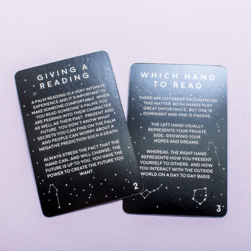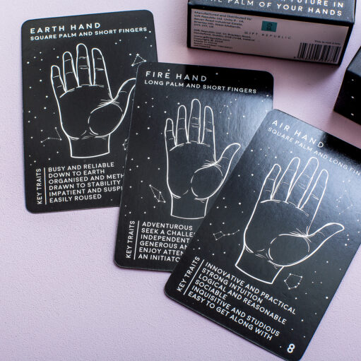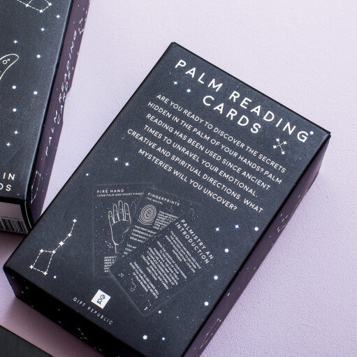Wat zegt het als je ene vinger korter is dan de ander? Waar loopt precies de Mercuriuslijn en wat kun je daar in lezen? De Palm reading kaarten van Gift Republic leren je alles over handlezen. Met deze set van honderd kaarten ontdek je hoe je je eigen hand – of die van je vriendinnen – kunt lezen. Zo ontdek je zelf hoe je toekomst eruit kan zien.