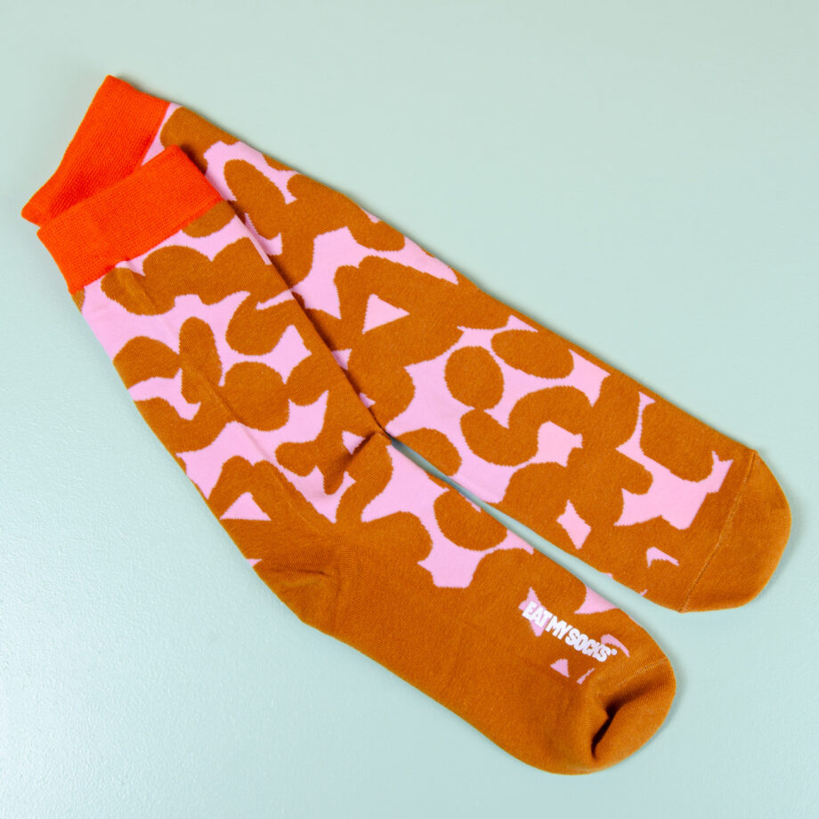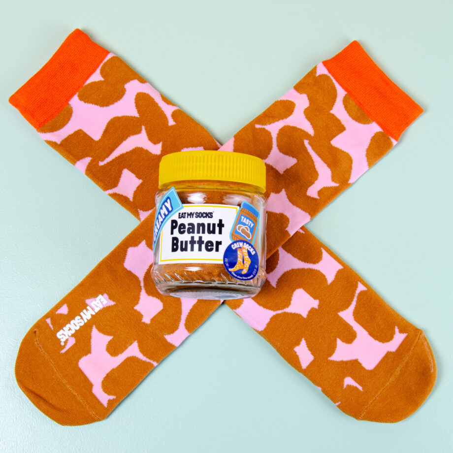 Pindakaas kun je bijna overal opsmeren: brood, banaan, appel, op pannenkoeken en volgens echte liefhebbers op nog veel meer etenswaren. En… op je voeten. Tenminste, als we het hebben over de Pindakaas sokken van Eat My Socks. Deze grappige sokken zien er in de verpakking precies uit als een potje pindakaas. In werkelijkheid is het één paar sokken in bruin met roze.