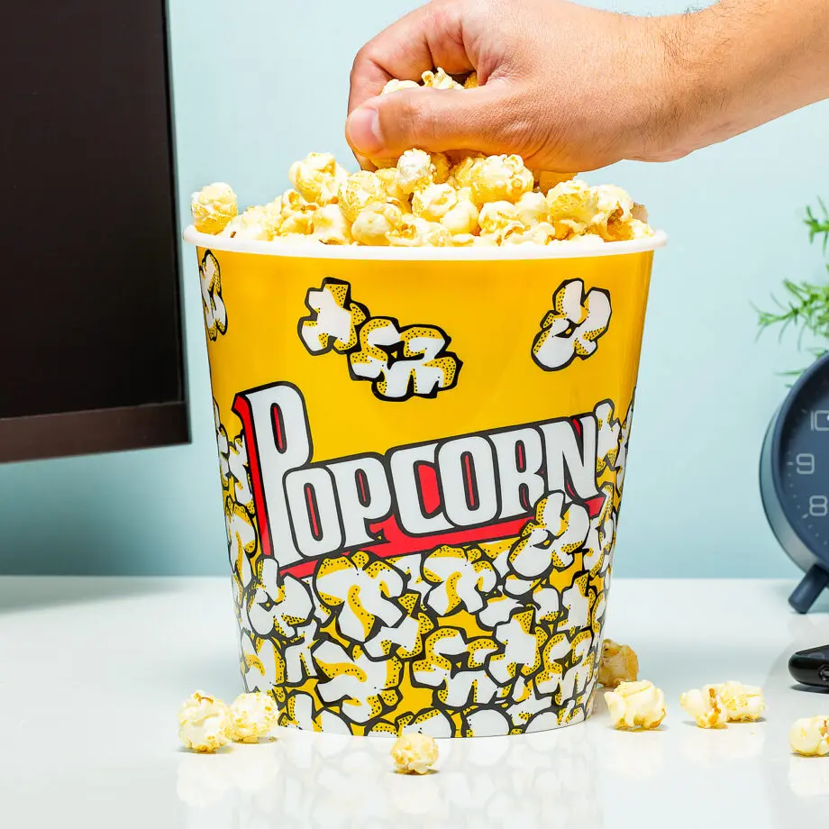 Een film kijken zonder popcorn is als tiramisu zonder lange vingers. Niet compleet dus. Grijp tijdens de filmavond een zak popcorn uit de keuken en serveer het in deze Popcorn bak van Balvi. Zo lijkt het net alsof jullie in de bioscoop zitten en is je privรฉ filmavondje helemaal compleet. Vul de popcorn emmer met zoete of zoute popcorn – mixen mag ook – en graaien maar! Er kan lekker veel van de snack in deze gele popcorn bak want hij heeft een inhoud van 2,8 liter. Is de filmavond voorbij? Bewaar de popcorn bak want doordat โie is gemaakt van polypropyleen kun je โm keer op keer opnieuw gebruiken.