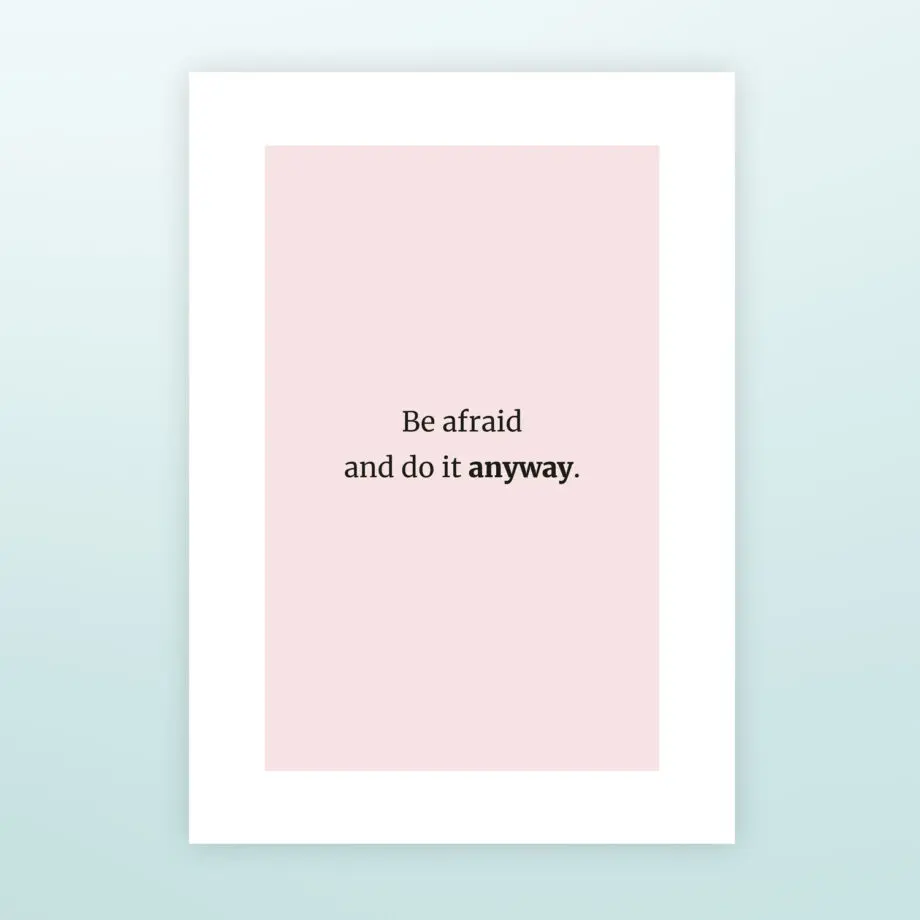 Alle verandering is eng, maar het kan heel goed uitpakken als je het gewoon probeert. Dat is ook de boodschap van de Poster Be afraid and do it anyway. Deze stijlvolle poster zorgt voor de nodige ondersteuning op het moment dat jij het het beste kunt gebruiken. Bijvoorbeeld als je je vaste baan opzegt en een eigen bedrijf begint. Of als je stopt met een relatie. Op de poster staat de tekst: Be afraid and do it anyway. Ook heel toepasselijk in coachingspraktijken.