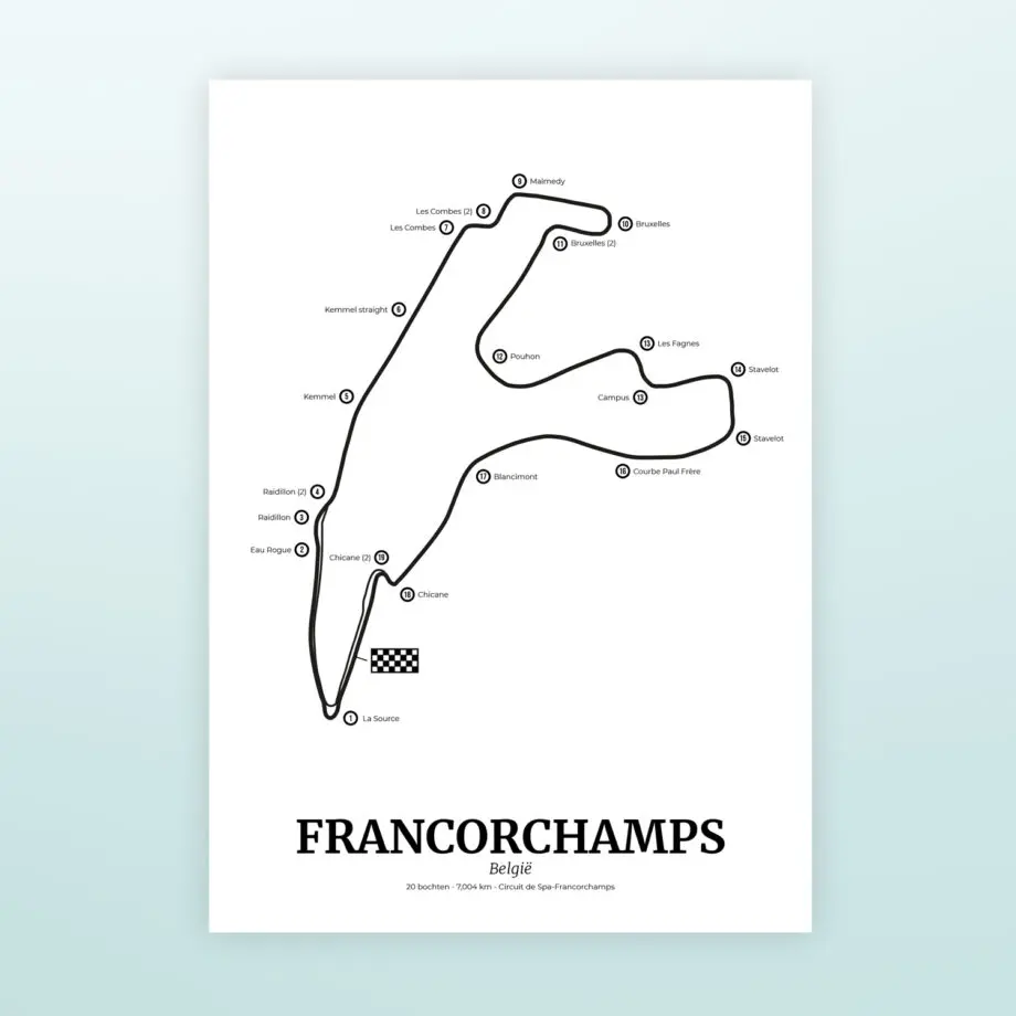 Voordat de Formule 1 terugkeerde naar Nederland was Spa-Francorchamps hét circuit om de Formule 1 coureurs in levende lijve te zien. De Poster Formule 1 circuit België Spa-Francorchamps is een origineel cadeau voor F1 fans die graag naar de race in België gaan. Op deze coole poster staat het 7 kilometer lange circuit afgebeeld met de namen van de bochten erbij.