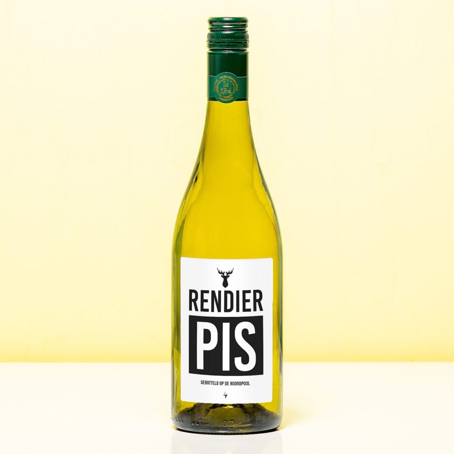 Rendier pis (Sauvignon Blanc). Humoristische fles witte wijn met de tekst: Rendier pis. Gebotteld op de Noordpool. De Sauvignon Blanc komt uit de Franse regio Pays d’Oc en heeft een helder geelgroene kleur met een intense neus van citrus, zacht tropisch fruit en gemaaid gras. Bevat een toets ananas, Granny Smith appel en meloen. Inhoud: 750 milliliter.
