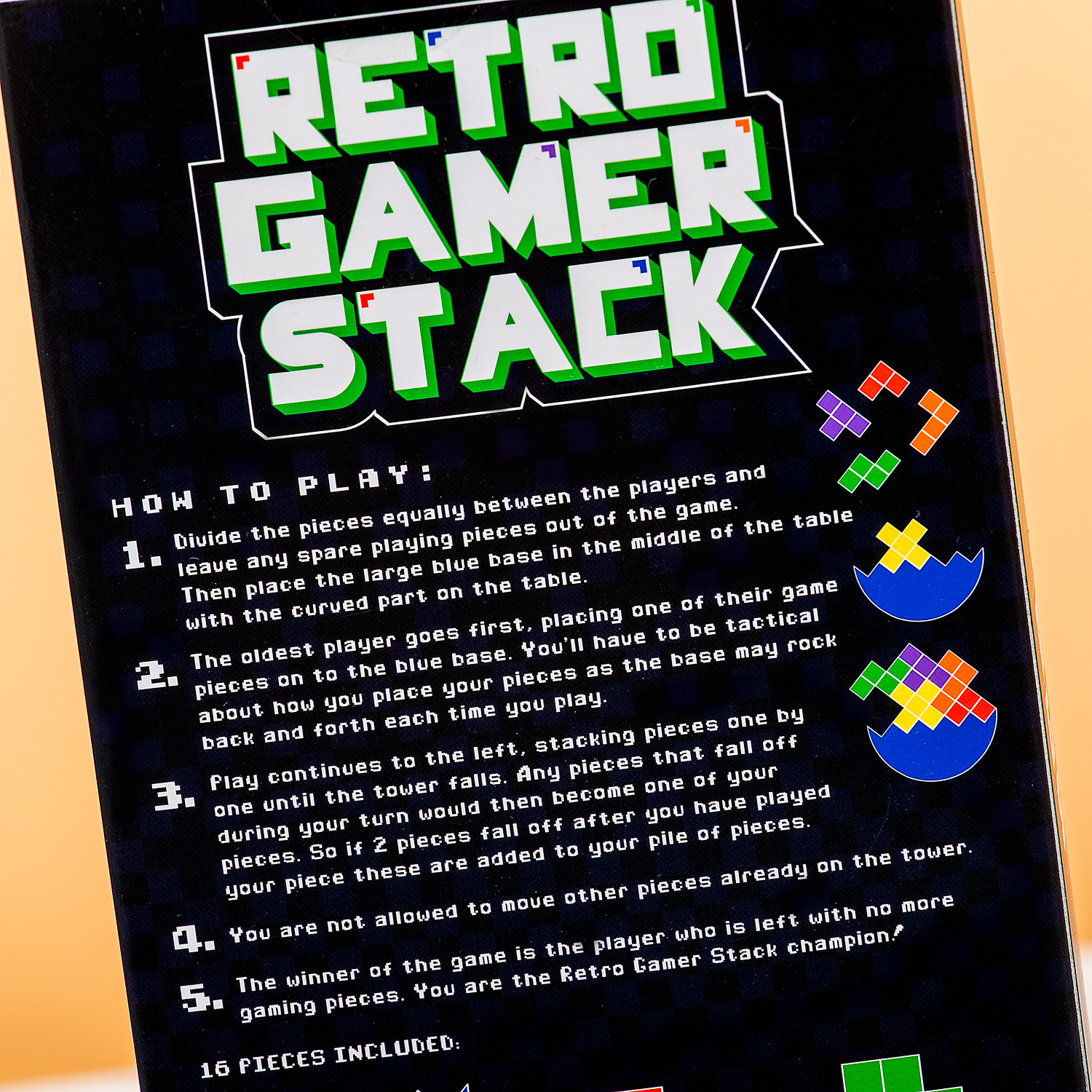 Heb jij een vaste hand? En ook nog een grote liefde voor retro games? Dan is het Retro game stapelspel van Gift Republic een leuke aanwinst voor je spelletjeskast! Dit originele stapelspel bevat een halfronde basis en vijftien speelstukken, die lijken op de figuren uit Tetris. Stapel zoveel mogelijk vormen op: als de toren valt is het spel afgelopen.