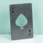 Speel je graag een potje kaarten met je vrienden? Dan moet je een extra kaart naast je hebben liggen, namelijk deze Schoppen aas flesopener. De bieropener ziet eruit als een schoppen aas speelkaart van staal. Met deze flesopener heb je zó dat koude biertje open gemaakt. Wel zo gezellig tijdens een spannend potje pokeren met je vrienden. Doordat de stalen flesopener hetzelfde formaat als een creditcard heeft, neem je ‘m makkelijk met je mee in je broekzak of portemonnee. Zo kom je nooit zonder bieropener te staan.