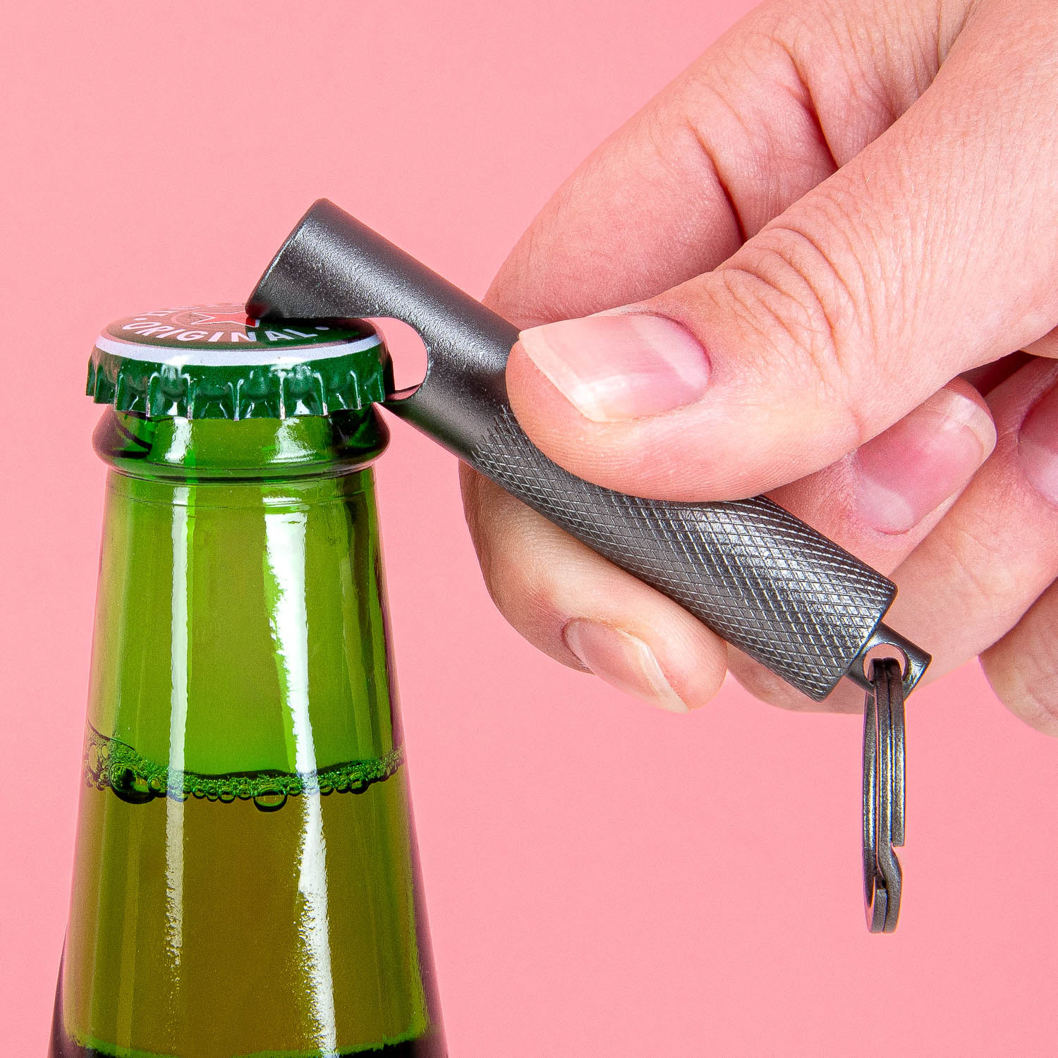 Met de Sleutelhanger flesopener van Kikkerland ben jij altijd klaar voor een feestje. Hang hem aan je sleutelbos en je kunt altijd een flesje bier of fris openmaken; of dat nu op een festival, in het park of tijdens een spontane borrel is. Lichtgewicht, stijlvol en onverwoestbaar. Een leuk én praktisch cadeau voor iedereen die dorst heeft.