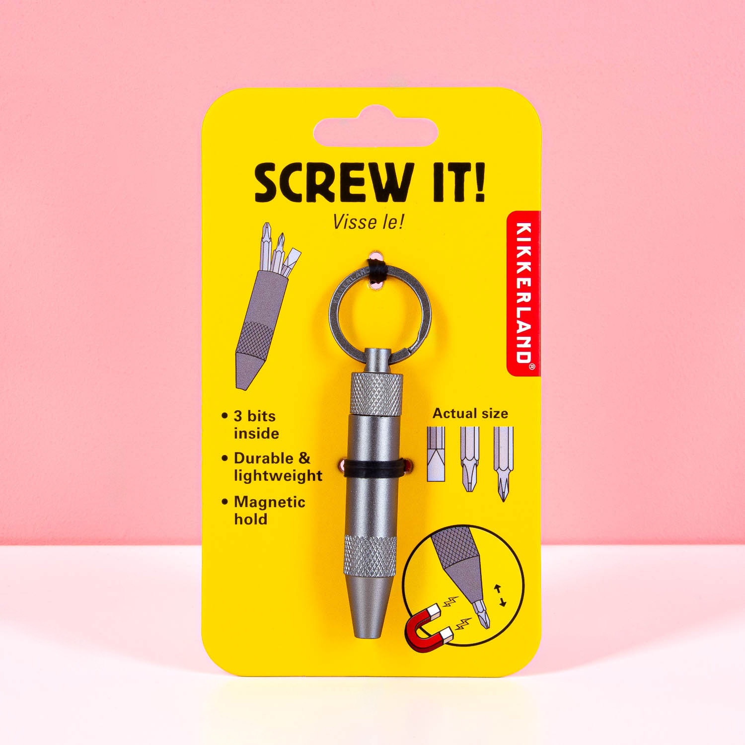 Je bent altijd voorbereid, zelfs onderweg, met deze Mini sleutelhanger schroevendraaier van Kikkerland. De sleutelhanger bevat 3 handige bitjes die je in een handomdraai wisselt. Ideaal voor het aandraaien van een los brilpootje, een elektronica klusje of zelfs een kastje dat ineens begint te wiebelen. Compact, stevig en dankzij de sleutelhanger altijd binnen handbereik. Een slim cadeautje voor iedereen die graag voorbereid is (of gewoon vaak dingen kapot maakt).