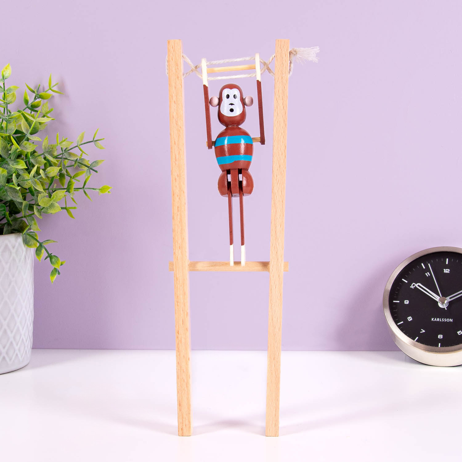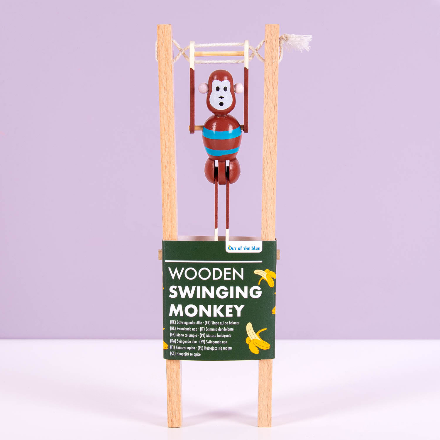 Zoek je een leuk, klein cadeautje voor een kind? Met het Slingerend aapje kan de kleine urenlang spelen. Dit aapje kan allerlei kunstjes, zoals koprollen maken. Het zit vast aan twee stokjes met elastiek. Door het naar voor en achter te bewegen gaat ‘ie slingeren.