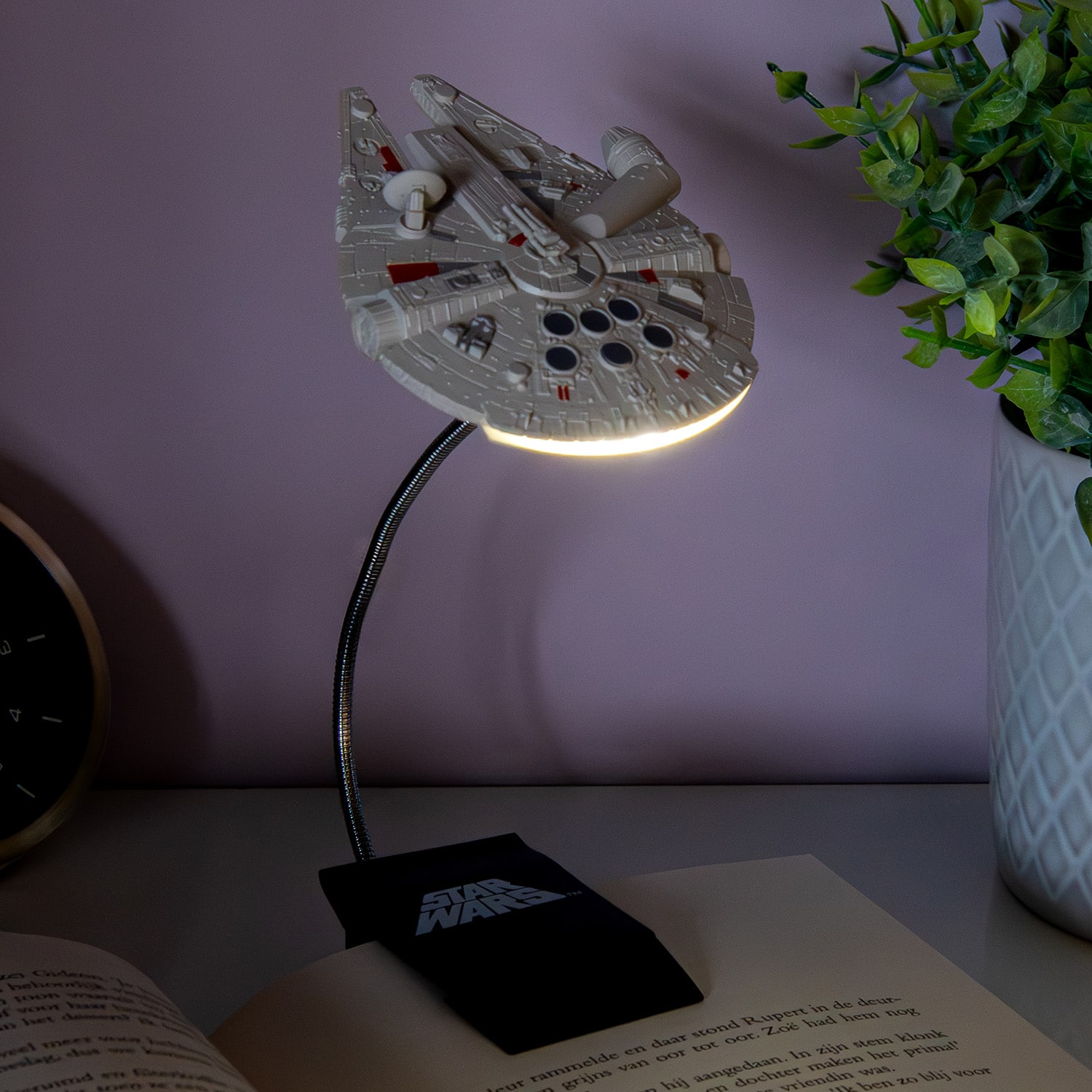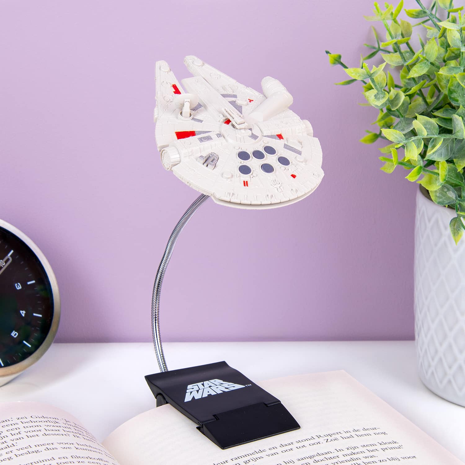 Millennium Falcon boeklampje van Star Wars. Boeklampje in de vorm van de Millennium Falcon. Stoere boeklamp voor Star Wars fans, die je met de clip aan je boek klemt, zodat je makkelijker kunt lezen in het donker. Door de flexibele stang heb je altijd licht op de juiste plek. Werkt op 3 AAA-batterijen (niet inbegrepen). Dit is een officieel gelicenseerd Star Wars product. Afmeting: 20 centimeter.