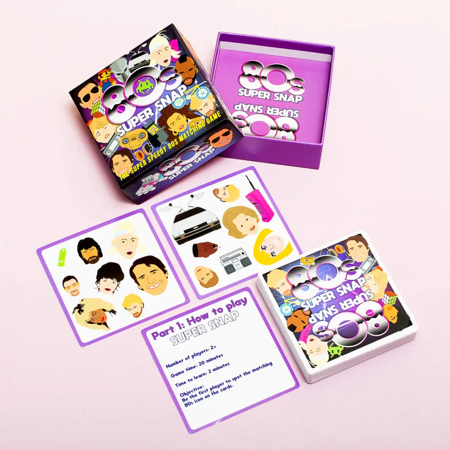 Een cassettebandje, Gremlins, David Bowie: als jij bent opgegroeid in de jaren tachtig dan herken je de iconen van het Super Snap spel van Gift Republic direct. Het is bij dit spel de bedoeling dat jij de iconen van de kaarten in je hand matcht met de kaarten die op tafel liggen. Verkrijgbaar in een 80s en 90s variant.
