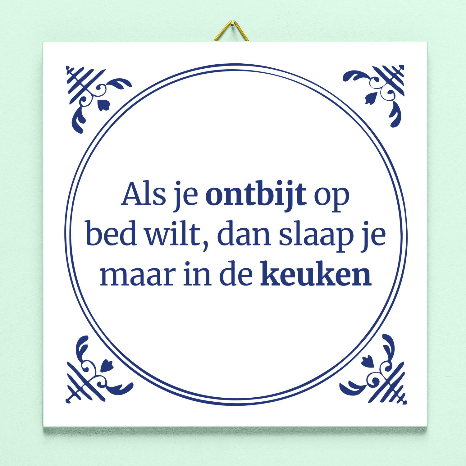 - Grappig tegeltje met de tekst: Als je ontbijt op bed wilt, dan slaap je maar in de keuken