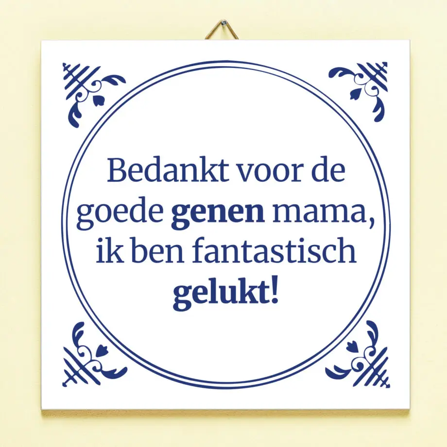 Je moeder is geweldig en daar wil je haar graag voor bedanken. Met Moederdag bijvoorbeeld of voor haar verjaardag. Het Tegeltje Bedankt voor de goede genen mama is hier heel geschikt voor. Op het tegeltje staat de niet zo bescheiden tekst: Bedankt voor de goede genen mama, ik ben fantastisch gelukt!. Een grapje en compliment in รฉรฉn!