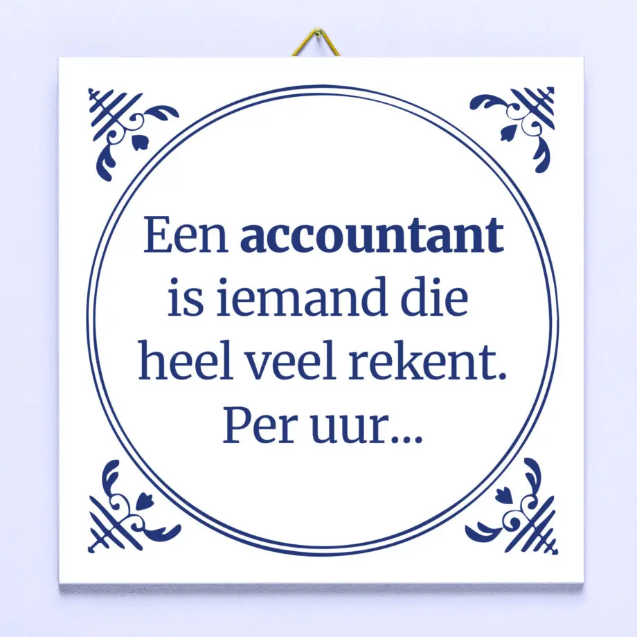 Je bent dol op al je collegaโs, maar een beetje plagen kan geen kwaad. Verras die ene accountant daarom met het Tegeltje Een accountant is iemand… Dit tegeltje heeft een gemoderniseerde, op Delfts blauwe geรฏnspireerde look, en bevat de tekst: Een accountant is iemand die heel veel rekent. Per uur…. Ook leuk om cadeau te geven aan je eigen accountant, nadat hij je weer een flinke factuur heeft gestuurd aan het eind van het jaar.