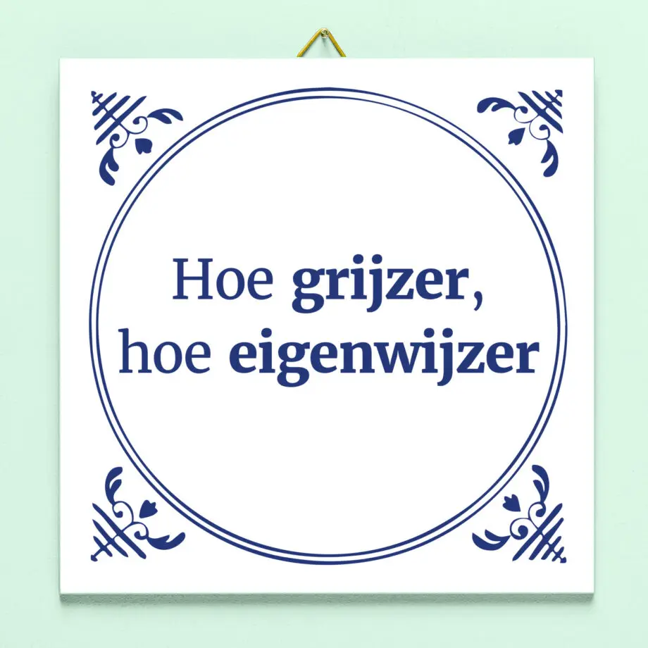 Gaan jouw ouders zich ook steeds dwarser gedragen? Wij weten wat de oorzaak daarvan is. Het komt door hun grijze haren! Het Tegeltje Hoe grijzer, hoe eigenwijzer bevestigd dat. Hoe grijzer je haar is, des te eigenwijzer ga je je gedragen. En als het op een tegeltje staat dan moet het wel waar zijn toch? Grappig als verjaardagscadeau voor een van je ouders, maar ook voor mensen die net hun eerste grijze haar hebben gevonden.