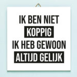 Het is heerlijk om altijd gelijk te hebben. Helaas beseft nog niet iedereen dat jij het altijd bij het rechte eind hebt. Daarom hang je het Tegeltje Ik ben niet koppig op op je werkplek of in je huis. Op het tegeltje staat de tekst: Ik ben niet koppig. Ik heb gewoon altijd gelijk. Een geinige quote, waarmee je direct ontkent dat jij een koppig persoon bent. Natuurlijk ook een heel geschikt cadeautje voor mensen die wél heel koppig zijn, maar dat niet willen toegeven.