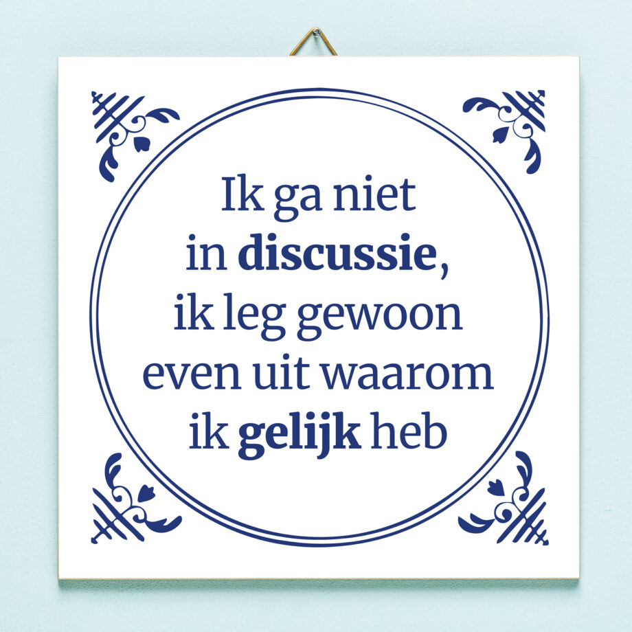 In discussie gaan heeft meestal niet veel zin, dat geeft het Tegeltje Ik ga niet in discussie ook aan. Op dit op Delfts blauw geïnspireerde tegeltje staat de tekst: Ik ga niet in discussie, ik leg gewoon even uit waarom ik gelijk heb. Een grappig cadeautje voor iemand die het altijd beter weet.