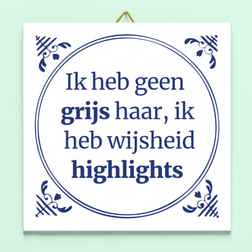 - Op het tegeltje staat de tekst: Ik heb geen grijs haar, ik heb wijsheid highlights