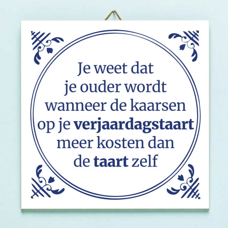 Natuurlijk is het super leuk om je verjaardag te vieren en natuurlijk haal je taart in huis. Kaarsjes erop? Tuurlijk, waarom niet! Het kan alleen een beetje confronterend zijn als je al wat ouder bent. Het Tegeltje Je weet dat je ouder wordt… beschrijft dat. Op dit moderne op Delfts blauwe tegeltje staat de tekst: Je weet dat je ouder wordt wanneer de kaarsen op je verjaardagstaart meer kosten dan de taart zelf.