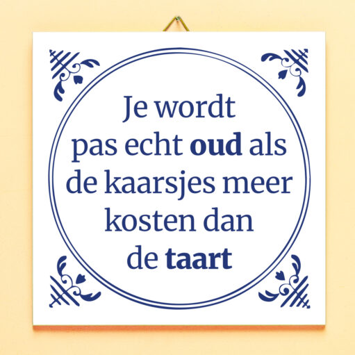 Een hele taart vol kaarsjes: dat is toch leuk? Helemaal als de jarige het liever niet over zijn of haar leeftijd wil hebben, omdat diegene zich oud voelt. Het Tegeltje Je wordt pas echt oud… is een grappig tegeltje om de jarige te plagen met zijn of haar leeftijd. Op de tegel staat de spreuk: Je wordt pas echt oud als de kaarsjes meer kosten dan de taart.