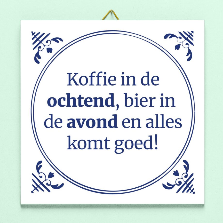 Tegeltje Koffie in de ochtend. Op Delfts blauw geรฏnspireerd tegeltje met de tekst: Koffie in de ochtend, bier in de avond en alles komt goed! Grappig tegeltje voor iedereen die volgens dit motto leeft. Het tegeltje is gemaakt van echt keramiek en wordt geleverd met een ophanghaakje. Het wordt bedrukt met hoge kwaliteit sublimatieprint. Afmeting: 15 x 15 centimeter.
