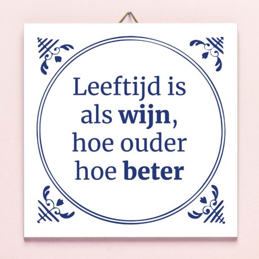 Ouder worden: lastig hè? Toch is het een stuk minder vervelend als je de quote op het Tegeltje Leeftijd is als wijn leest. Deze laat je zien dat ouder worden helemaal niet erg is. Op het tegeltje staat namelijk de tekst: Leeftijd is als wijn, hoe ouder hoe beter. Een vrolijk tegeltje in Delfts blauwe stijl, met een tekst die je leert omdenken en daarmee een perfect cadeautje is. Het tegeltje wordt geleverd met een tegelhaakje, waarmee hij aan de muur kan hangen.