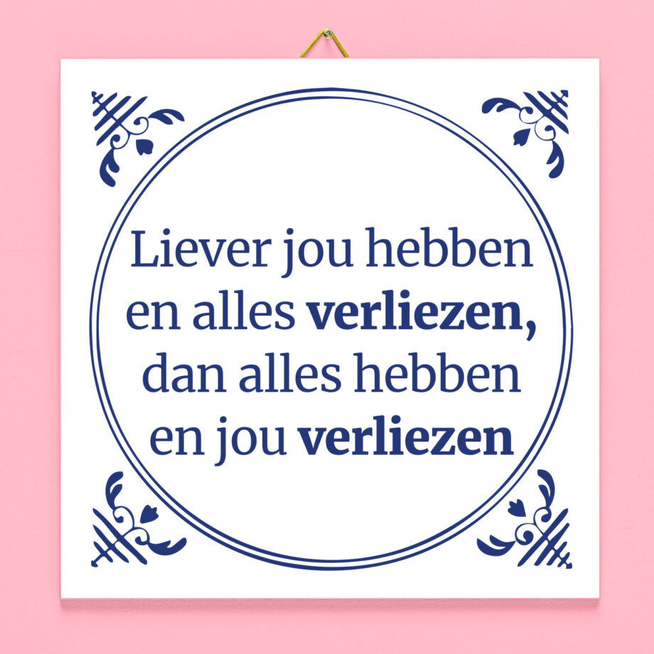 Een mooi huis, een wereldreis, een topauto: het is allemaal hartstikke mooi en aardig, maar geniet je er net zo van als je je partner niet meer naast je hebt? Het Tegeltje Liever jou hebben… is een lief tegeltje om cadeau te geven aan je geliefde. Op het tegeltje staat de tekst: Liever jou hebben en alles verliezen, dan alles hebben en jou verliezen.