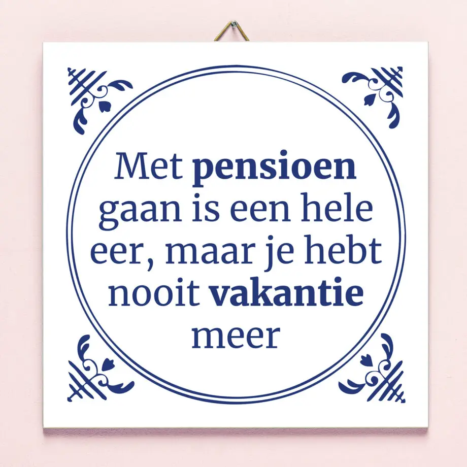 Ben je eindelijk met pensioen, zit je partner je achter de vodden met alle klusjes die je je hele werkende leven lang hebt laten liggen. Het Tegeltje Met pensioen gaan is een hele eer en bereidt je hier vast op voor. Op het tegeltje staat de tekst: Met pensioen gaan is een hele eer, maar je hebt nooit vakantie meer. Weg vakantiedagen, hallo klusjes!