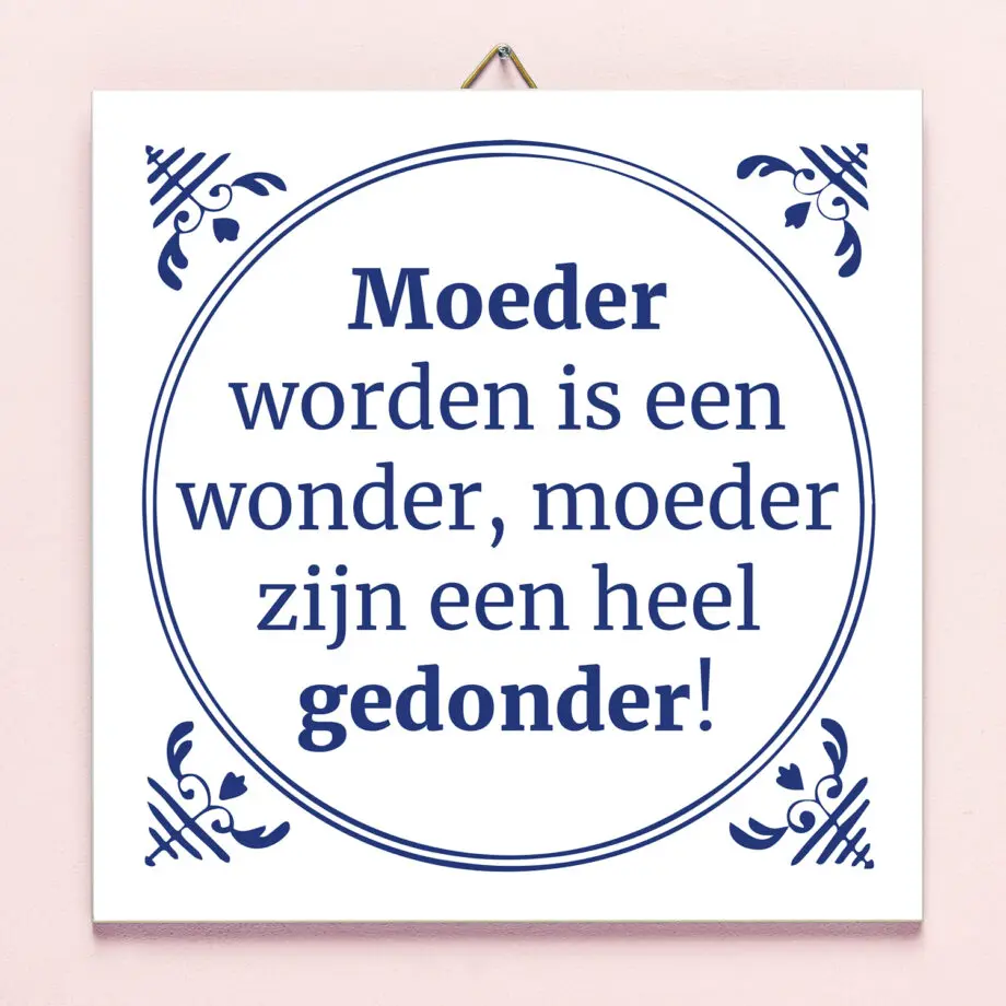 Moeder worden is een wonder, moeder zijn een heel gedonder. Leuker kunnen we het niet maken! Het Tegeltje Moeder worden is een wonder is een grappig cadeau voor oververmoeide moeders die af en toe denken: waar bรฉn ik aan begonnen? Verras je moeder dus regelmatig, met haar verjaardag, Moederdag en gewoon zomaar.
