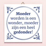 - Met de tekst: Moeder worden is een wonder, moeder zijn een heel gedonder