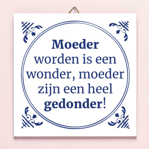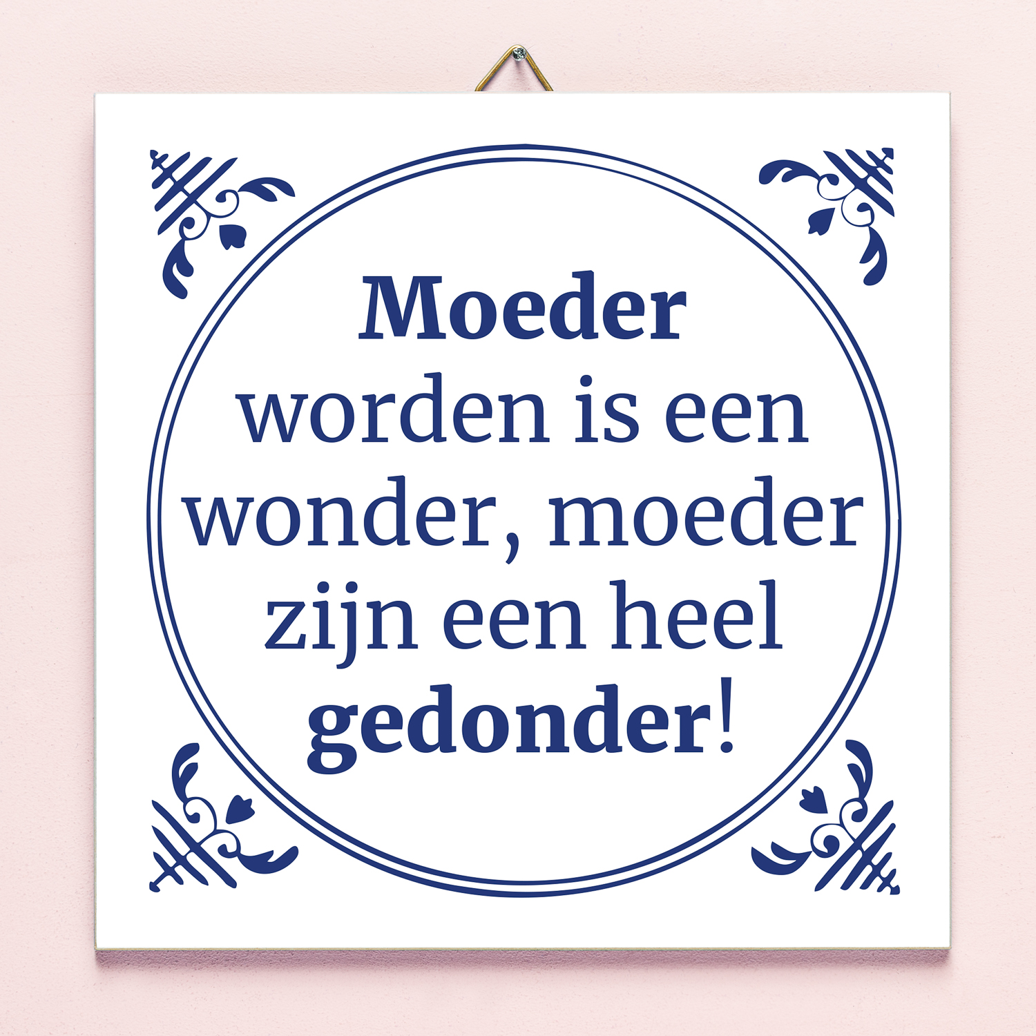 Moeder worden is een wonder, moeder zijn een heel gedonder. Leuker kunnen we het niet maken! Het Tegeltje Moeder worden is een wonder is een grappig cadeau voor oververmoeide moeders die af en toe denken: waar bén ik aan begonnen? Verras je moeder dus regelmatig, met haar verjaardag, Moederdag en gewoon zomaar.