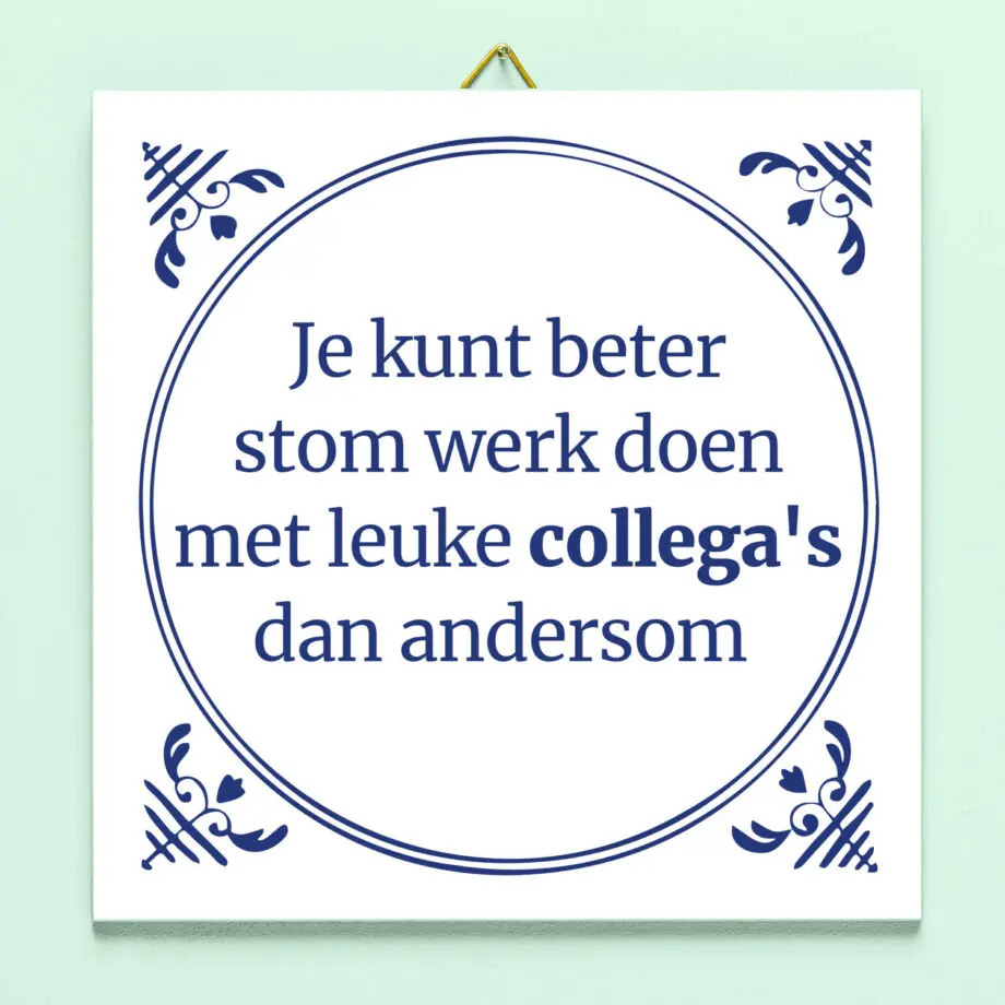 Jouw collegaโ€™s zijn geweldig en daarom ga je graag naar je werk. Zelfs als het werk niet altijd even leuk is. Het Tegeltje Stom werk, leuke collegaโ€™s bevat een spreuk die helemaal bij jouw instelling past. Op de op Delfts blauwe tegel staat de tekst: Je kunt beter stom werk doen met leuke collegaโ€™s dan andersom. Perfect om cadeau te geven aan je collega of om op te hangen op kantoor.