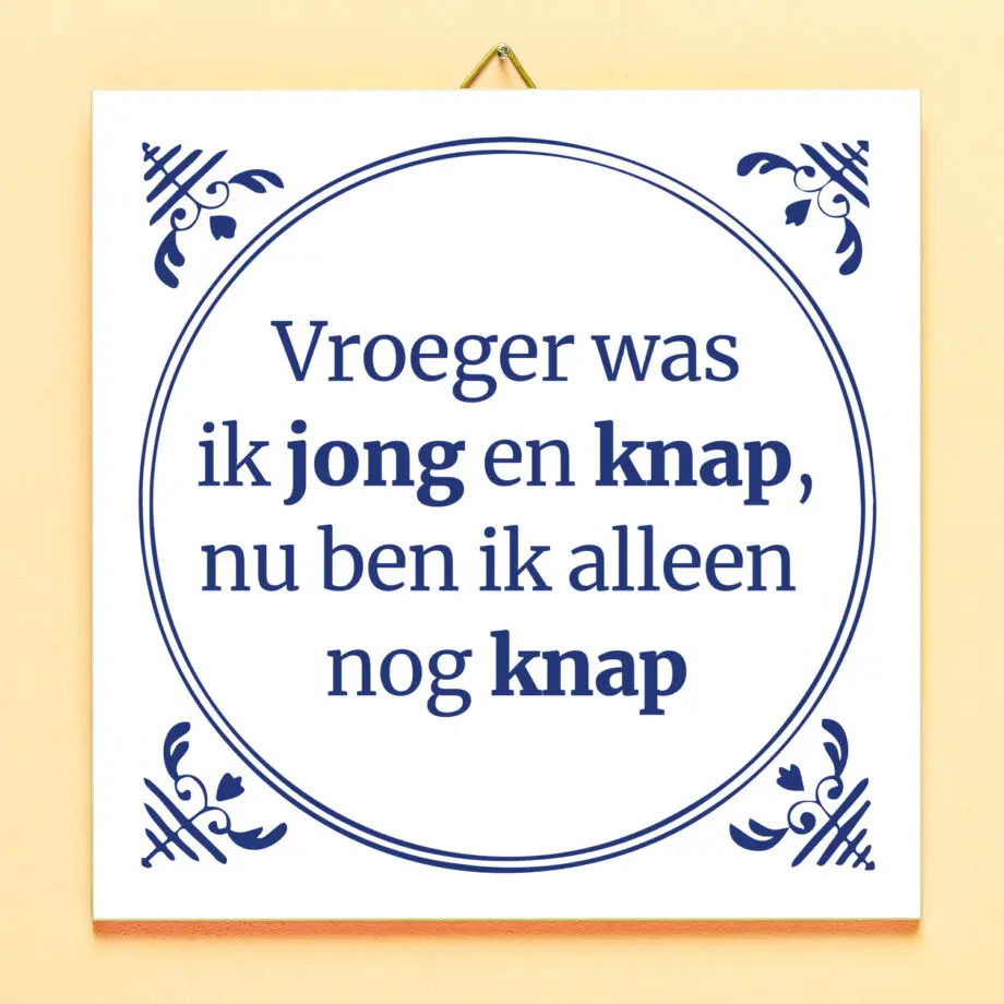 Vroeger was alles beter. Je was jong, knap en de zwaartekracht had nog geen grip op je lichaam. En toch mag je er zeker nog wezen. Geef je partner, vriendin of zus die moeite heeft met ouder worden het Tegeltje Vroeger was ik jong en knap cadeau. Een grappig op Delfts blauw geรฏnspireerd tegeltje met de tekst: Vroeger was ik jong en knap, nu ben ik alleen nog knap. In feite รฉรฉn groot compliment dus!