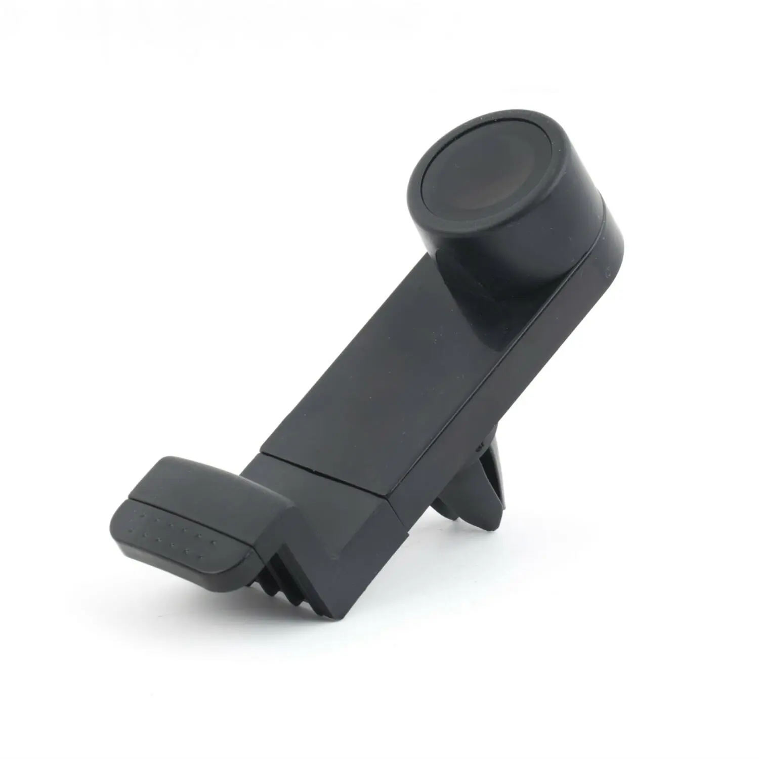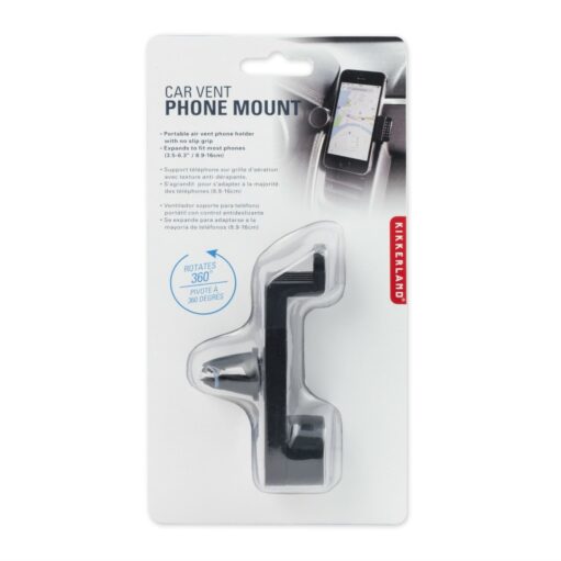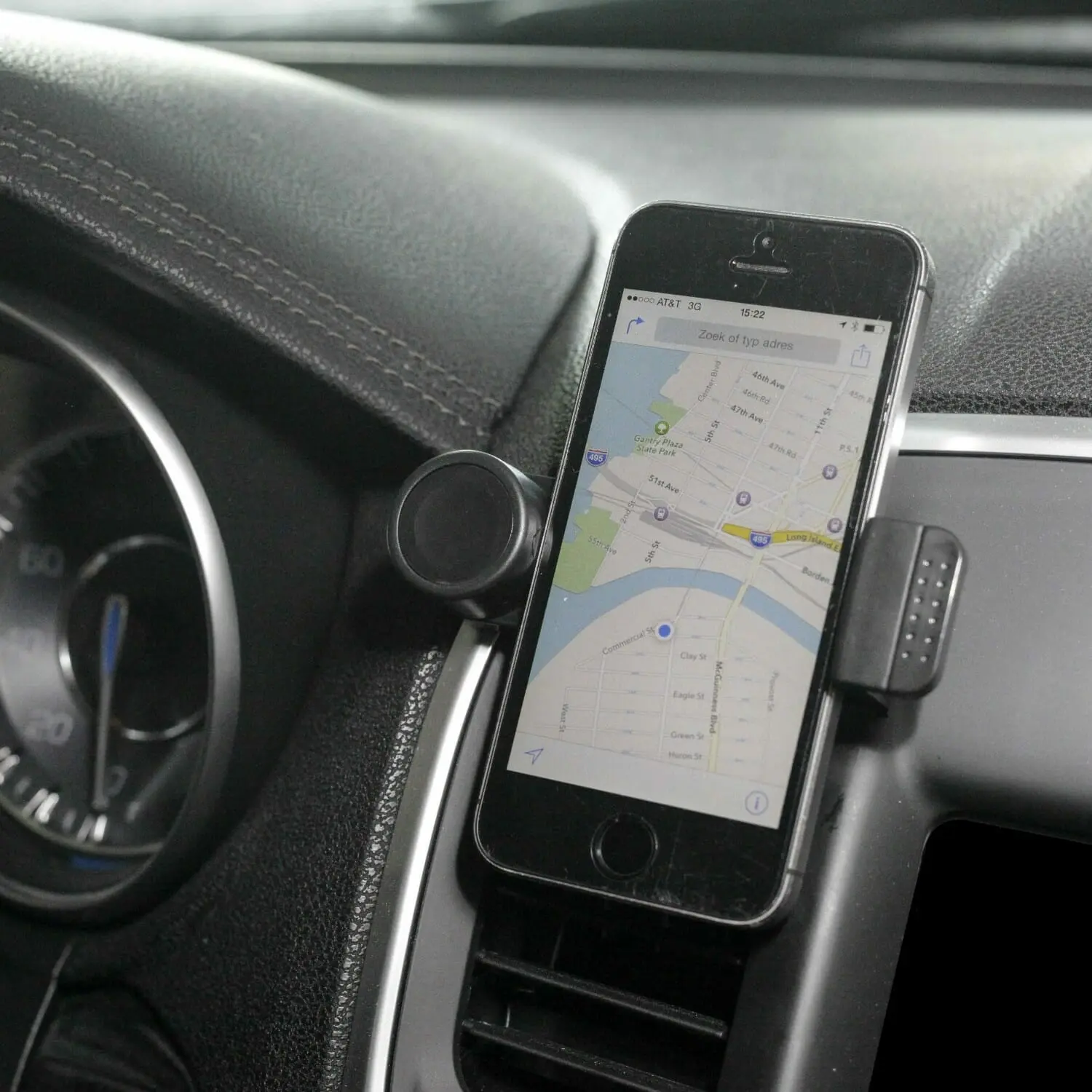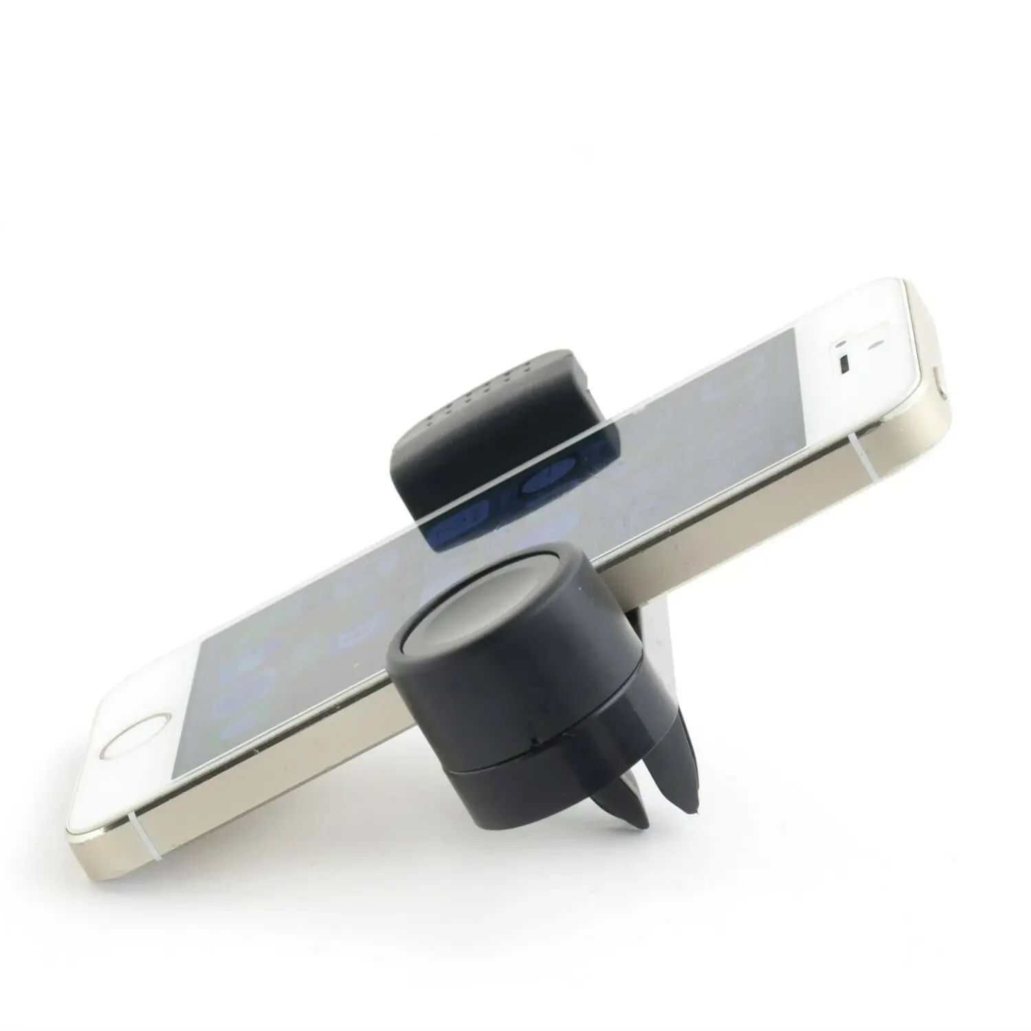 Telefoonhouder voor in het luchtrooster van de auto. De smartphonehouder is gemaakt van zwart kunststof. Twee manieren om in het ventilatierooster te steken, geschikt voor dunnere en dikkere roosters. Past in de meeste ventilators en geschikt voor de meeste smartphones (8,9-16 cm). Houder is 360 graden te roteren, zodat hij zowel horizontaal als verticaal als navigatie gebruikt kan worden. Afmeting: 9,5 x 5 x 3 centimeter. Lichtgewicht telefoonhouder van 52 gram.