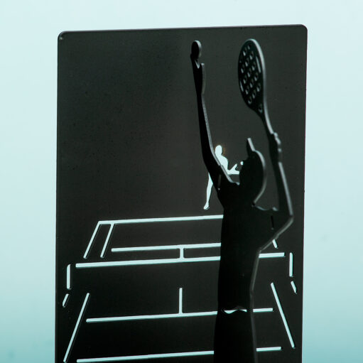 - Metalen boekensteun met een tennisser die gaat serveren