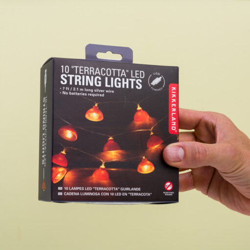 Met het Terracotta lichtsnoer van Kikkerland kun je op een eenvoudige manier sfeer creëren in je slaapkamer of op je werkplek. Dit originele lichtsnoer heeft tien lampjes, met een lampenkapje in terracotta kleur. Je plugt de lichtslinger in de USB-poort van je laptop of gebruikt hem met een adapter in het stopcontact. Een origineel cadeautje voor iemand die op kamers gaat wonen of als housewarmingscadeau.