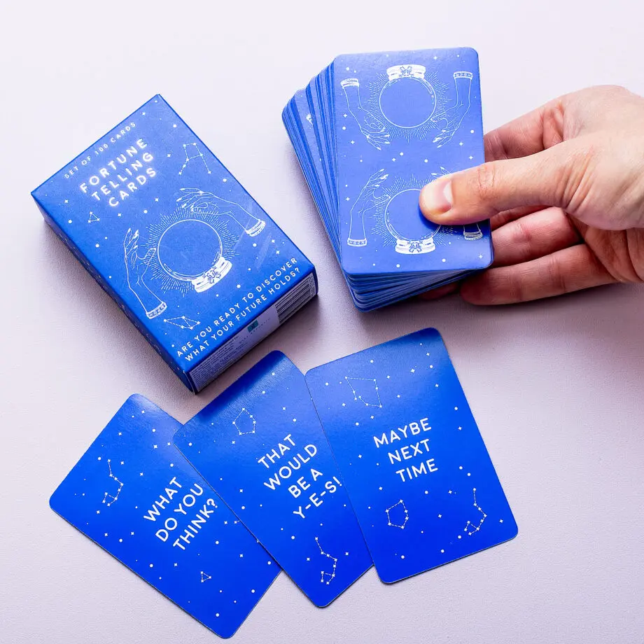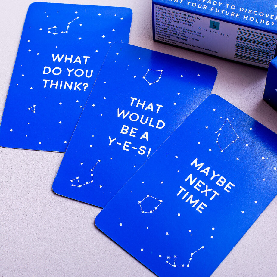 Een waarzegger bezoeken gaat je misschien wat ver, maar antwoord op je vragen krijgen is altijd fijn. De Toekomstvoorspellende kaarten van Gift Republic kunnen je hiermee helpen. Deze kaarten hebben een humoristische insteek (zoals: No, go away), dus je gebruikt ze vooral om antwoord te krijgen op niet al te serieuze vragen. In de verpakking zitten maar liefst honderd antwoorden.
