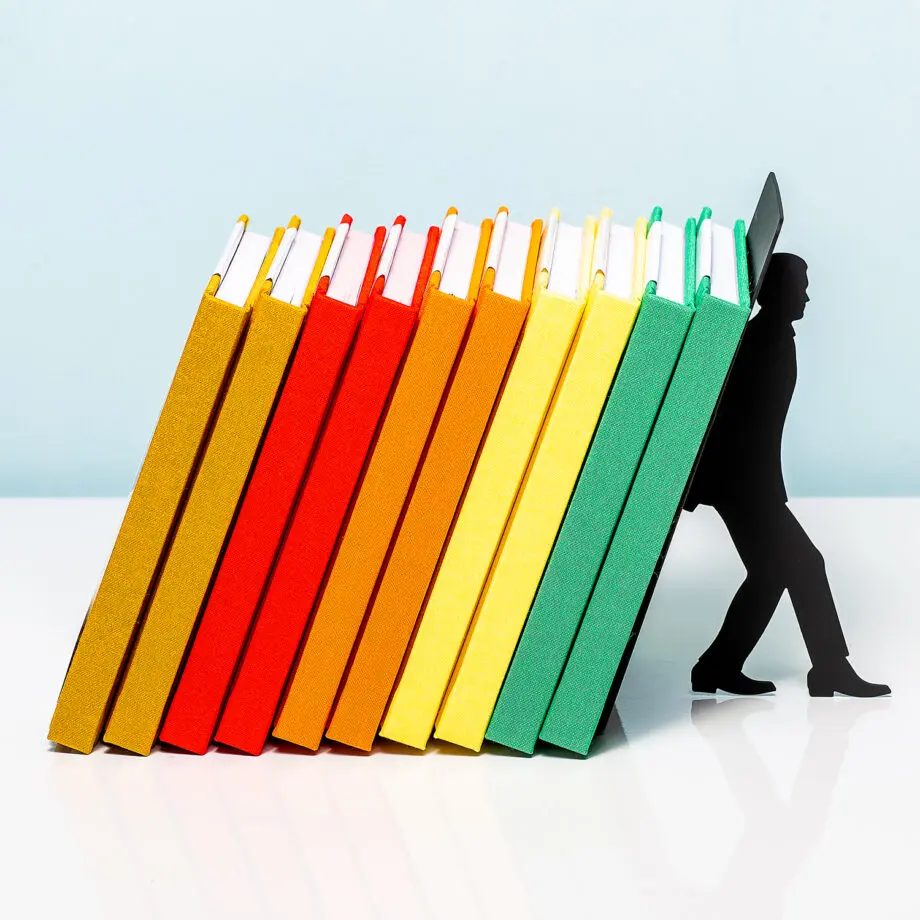 Boekensteun met man die boeken tegenhoudt van Balvi