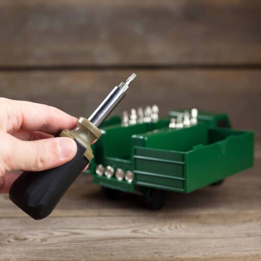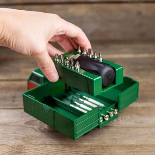 Woon je al vijf jaar op jezelf en heb je nog steeds geen enkel stuk gereedschap? Bel je voor elk klusje je pa? Stop daarmee en word eens volwassen! Met de Truck toolkit van Kikkerland heb je de eerste handige gereedschappen alvast in huis. De truck kan opengeklapt worden, waarna je zijn waardevolle inhoud ziet. Die bestaat uit vier precisieschroevendraaiers, een handvat en tien verschillende schroevendraaierbitjes. Een ideaal cadeautje voor iedereen zonder gereedschap.