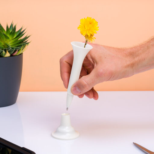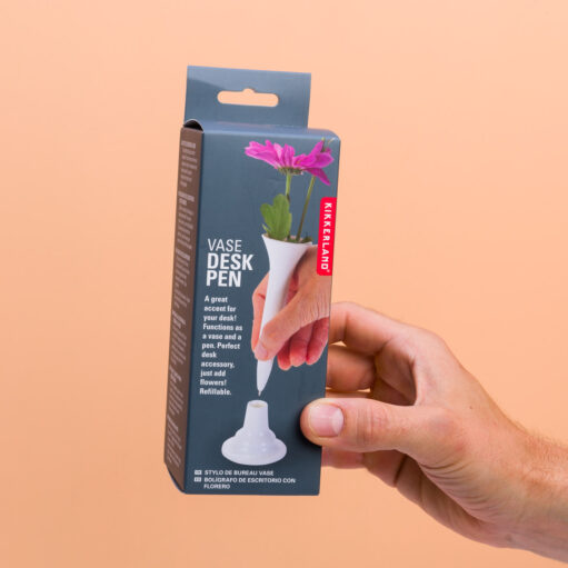 Natuurlijk is een bureau vooral bedoeld om aan te werken, maar een beetje gezelligheid kan ook geen kwaad. Met de Vaas pen van Kikkerland vrolijk jij je bureau op in een handomdraai. Het is een pen en een vaas in één. Je kunt enkele bloemen in het vaasje zetten, maar de pen ook gebruiken als je er een nodig hebt. Natuurlijk moet je het vaasje dan niet te ver vullen met water.