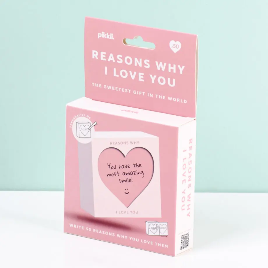Ik hou van jou omdat… je altijd lief bent voor me, elke ochtend de vaatwasser uitpakt of denkt aan kleine dingen die belangrijk voor me zijn. Iedereen heeft zijn eigen redenen waarom hij dol is op zijn partner. En op Vijftig redenen waarom ik van je hou van Pikkii kun je ze allemaal opschrijven. Dit doosje met een uitsnede van een hart is speciaal ontworpen om een belangrijk iemand in je leven te laten weten waarom diegene belangrijk voor je is.