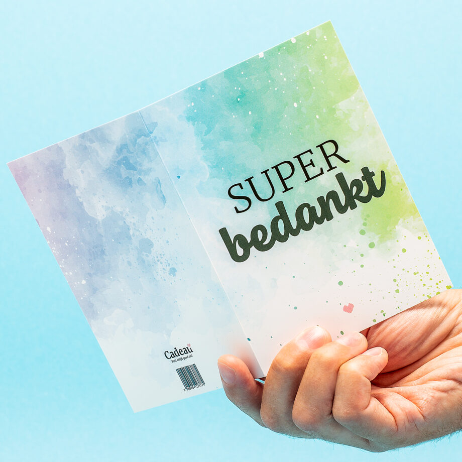 Wil jij een bedankje aan iemand sturen? Heeft een ander iets liefs voor jou gedaan en wil je diegene hier voor bedanken? Stuur dan de Wenskaart Bedankt! Deze mooie dubbele kaart heeft een vrolijk design en natuurlijk de tekst super bedankt. Zoek een leuk cadeautje uit in onze webshop en stuur tegelijkertijd dit kaartje mee. Je kunt hem natuurlijk ook gewoon aan je eigen bestelling toevoegen. De dubbele kaart op A6 formaat wordt geleverd met envelop.