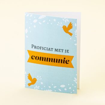 Zoek je een leuk kaartje voor iemand die communie gaat doen? Verras hem of haar met de Wenskaart Communie. Deze kaart kun je, met een persoonlijke boodschap en een cadeautje, rechtstreeks naar de ontvanger sturen. De kaart is voorzien van de tekst Proficiat met je communie en een illustratie van vogels en bladeren.
