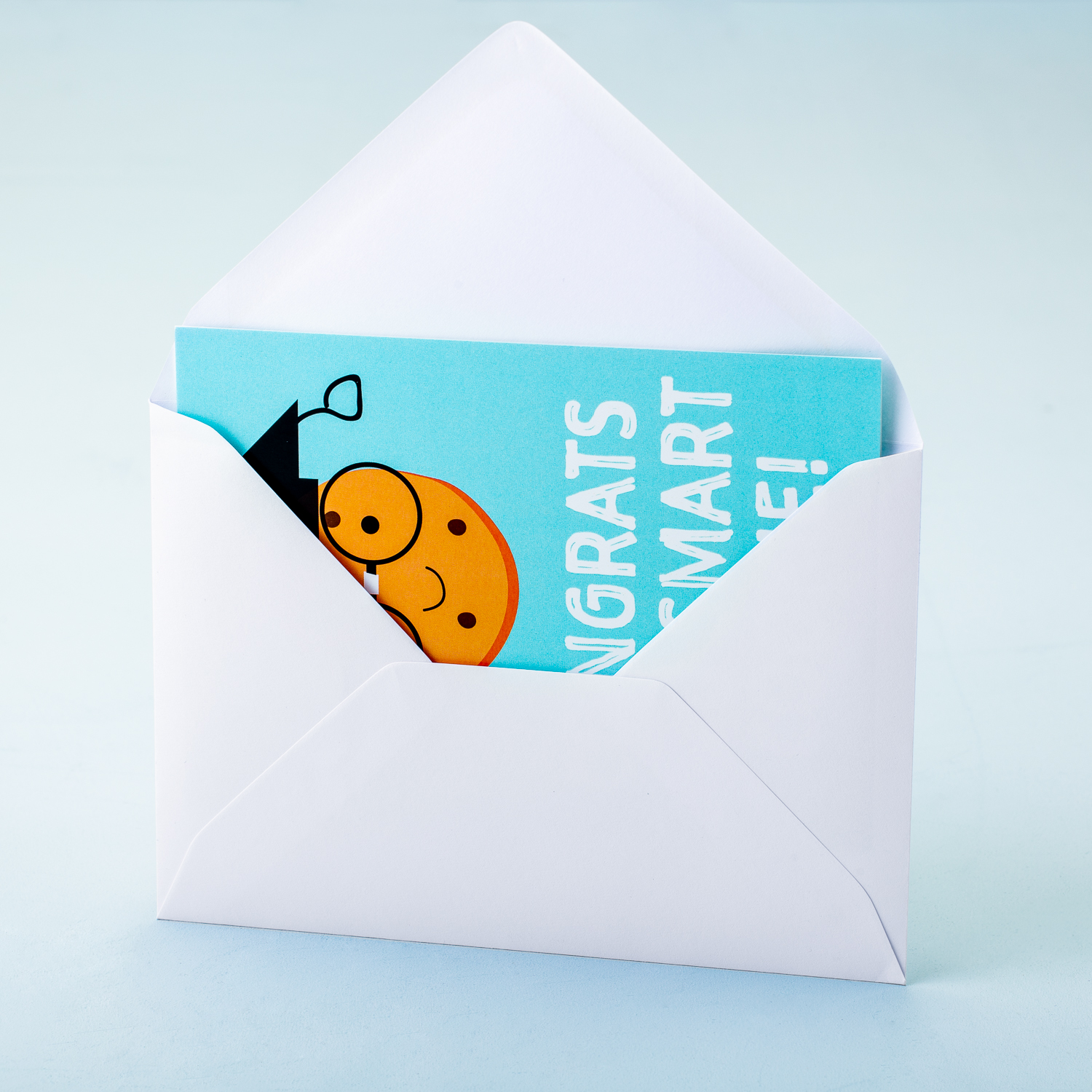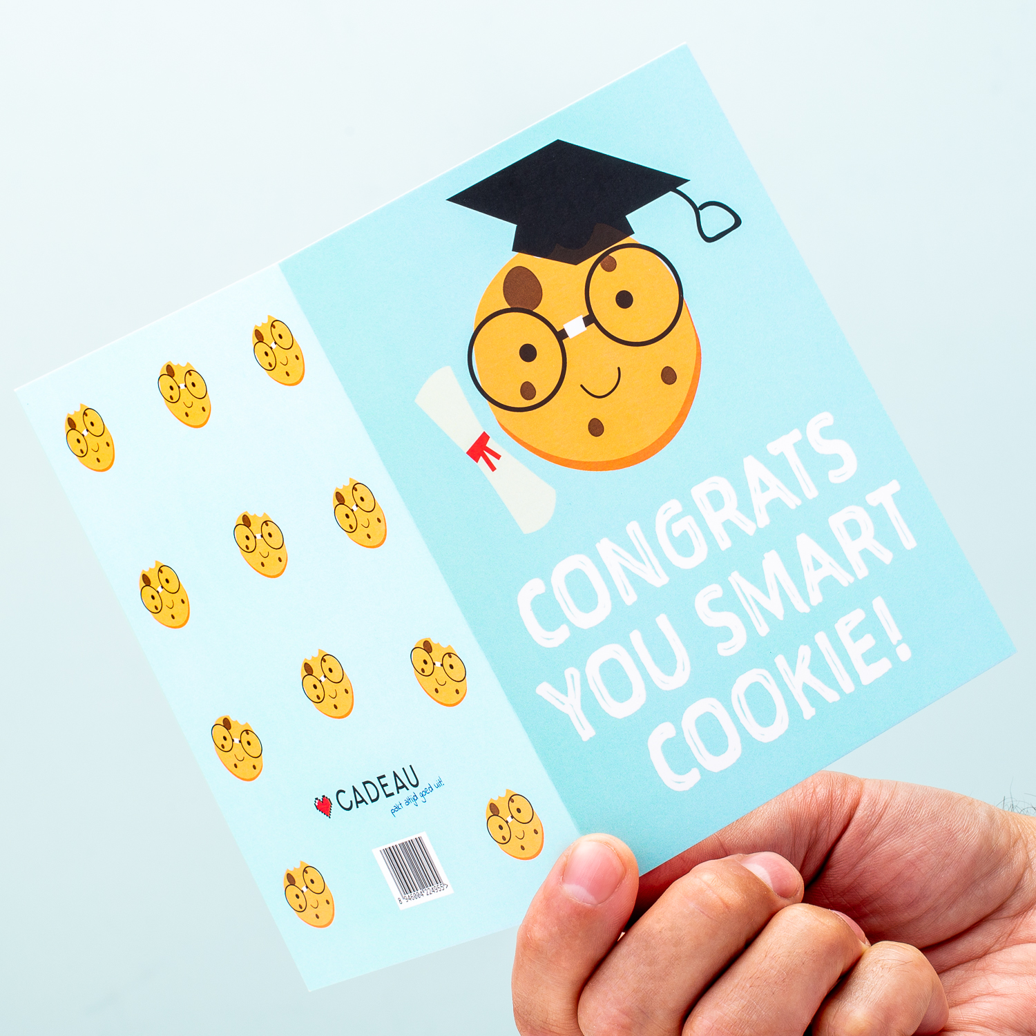 Hey, slimmerik, van harte gefeliciteerd met het slagen voor je examens. Feliciteer de geslaagde met de Wenskaart Congrats You Smart Cookie!. Deze grappige wenskaart heeft een illustratie van een chocolate chip koekje met een afstudeerhoed, bril en een diploma. Daar onder staat de tekst: Congrats You Smart Cookie! Je kunt de kaart rechtstreeks verzenden naar de ontvanger met een persoonlijke boodschap. Het is ook mogelijk om de kaart te ontvangen bij je bestelling, zodat je hem zelf kunt beschrijven.